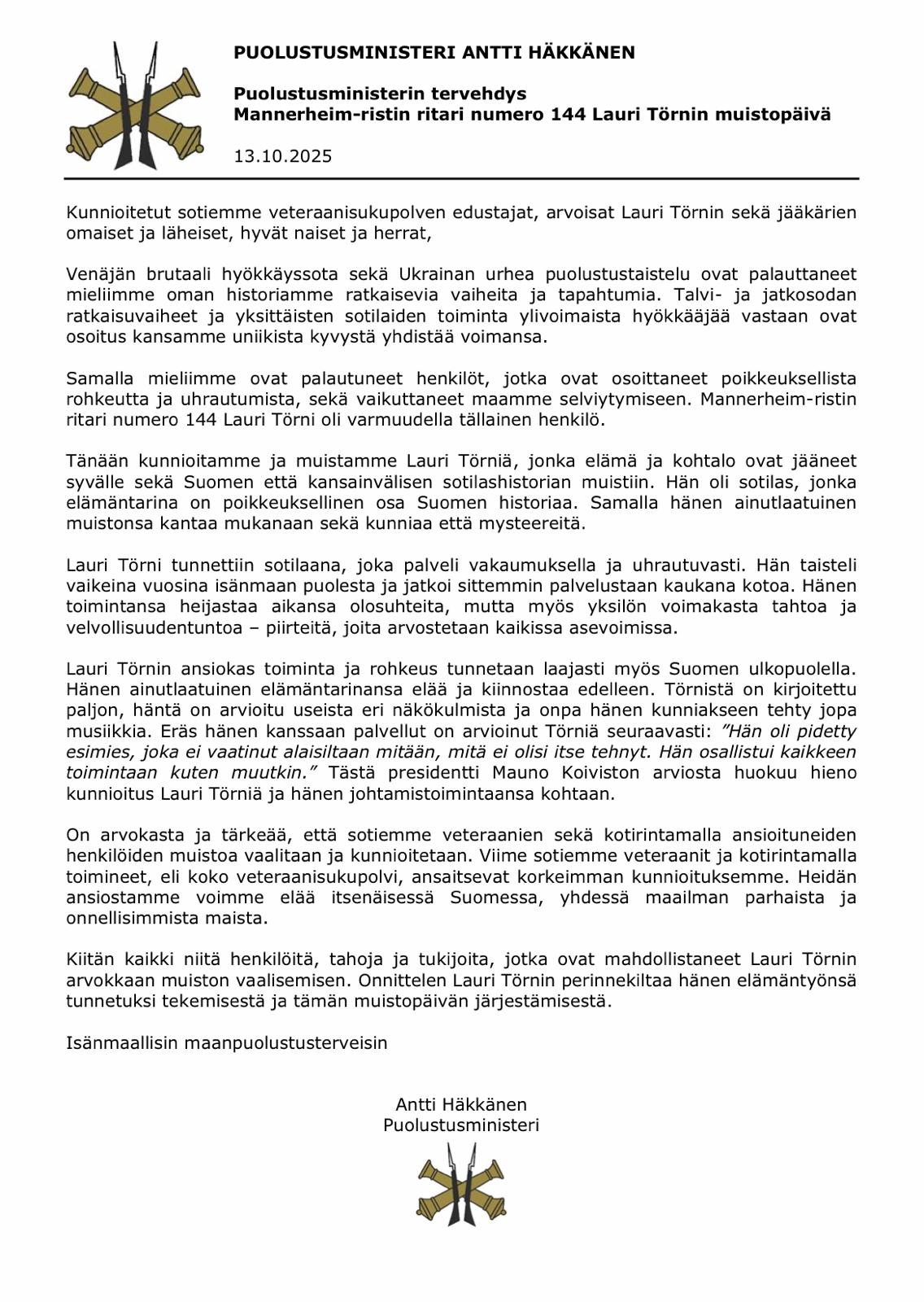 Killan puheenjohtaja Seppo Katajisto luki puolustusministeri Häkkäsen tervehdyksen, jonka jälkeen Mannerheim-ristin ritarien säätiön toiminnanjohtaja majuri Marko Maaluoto toi säätiön terveiset. Tämän jälkeen kohotettiin malja Lauri Törnille.